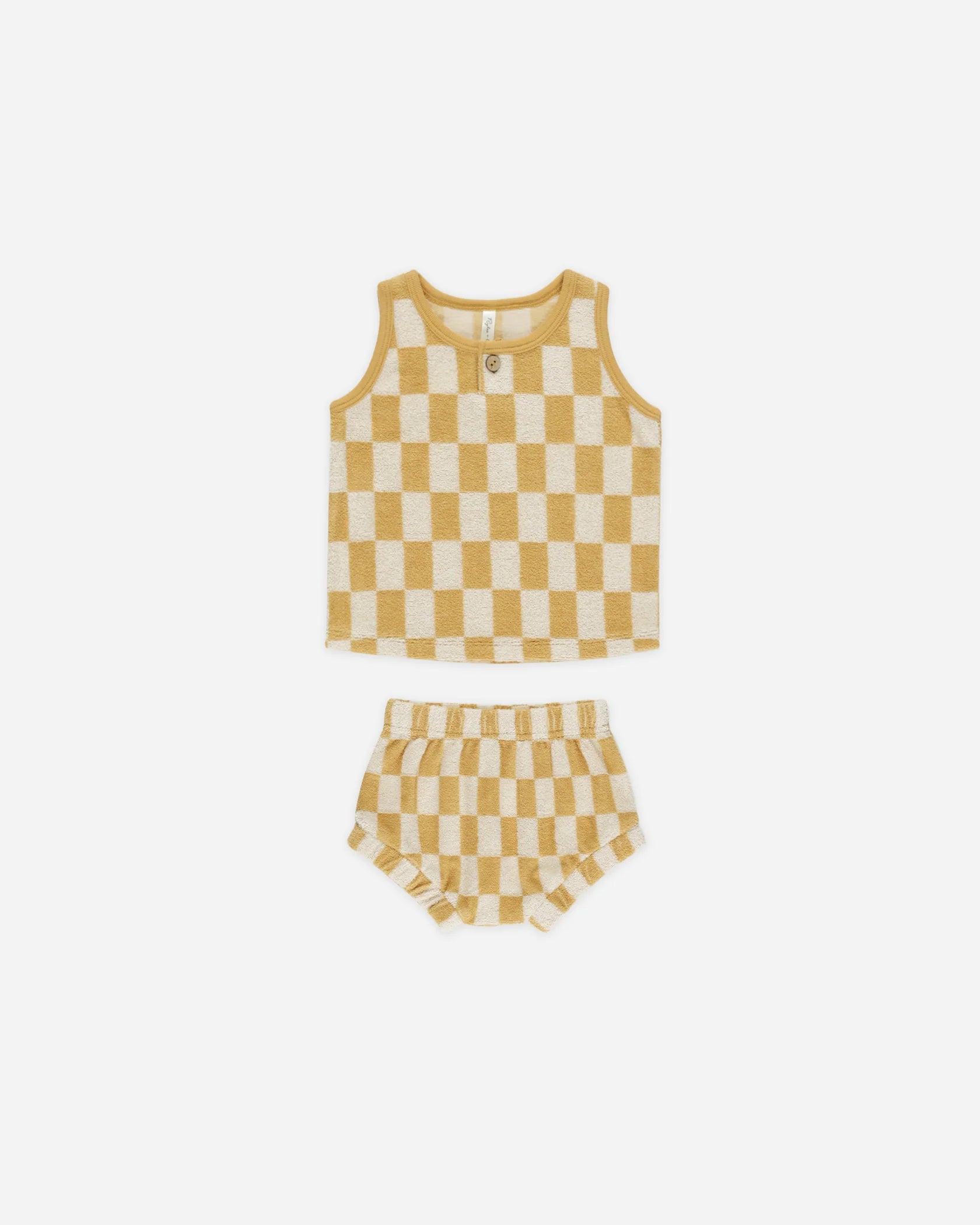 This everyday terry cloth set features a tank top with button detail, and coordinating bloomers with an elastic waistband and leg openings.