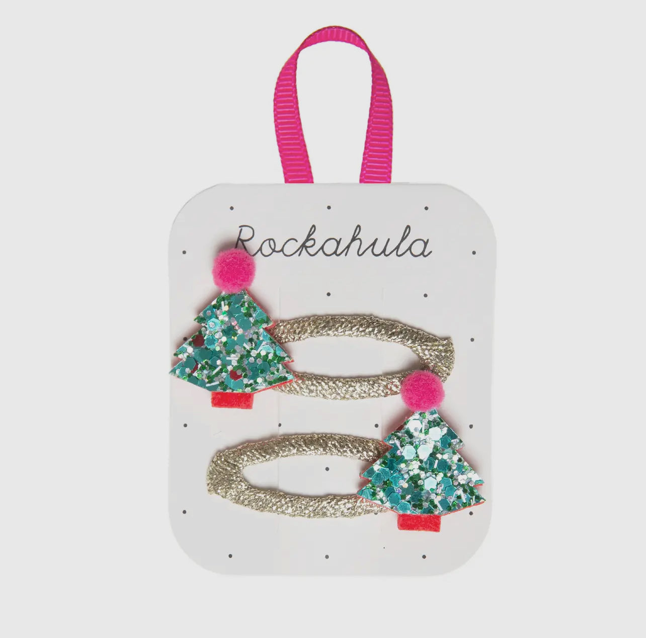 Get into the festive spirit with these super sparkly Xmas tree clips! A pair of glitter Christmas trees, topped with a perfect pink pom pom, these hair clips are secured onto golden ribbon wrapped snap clips.