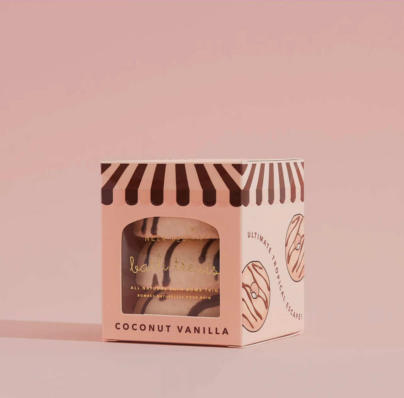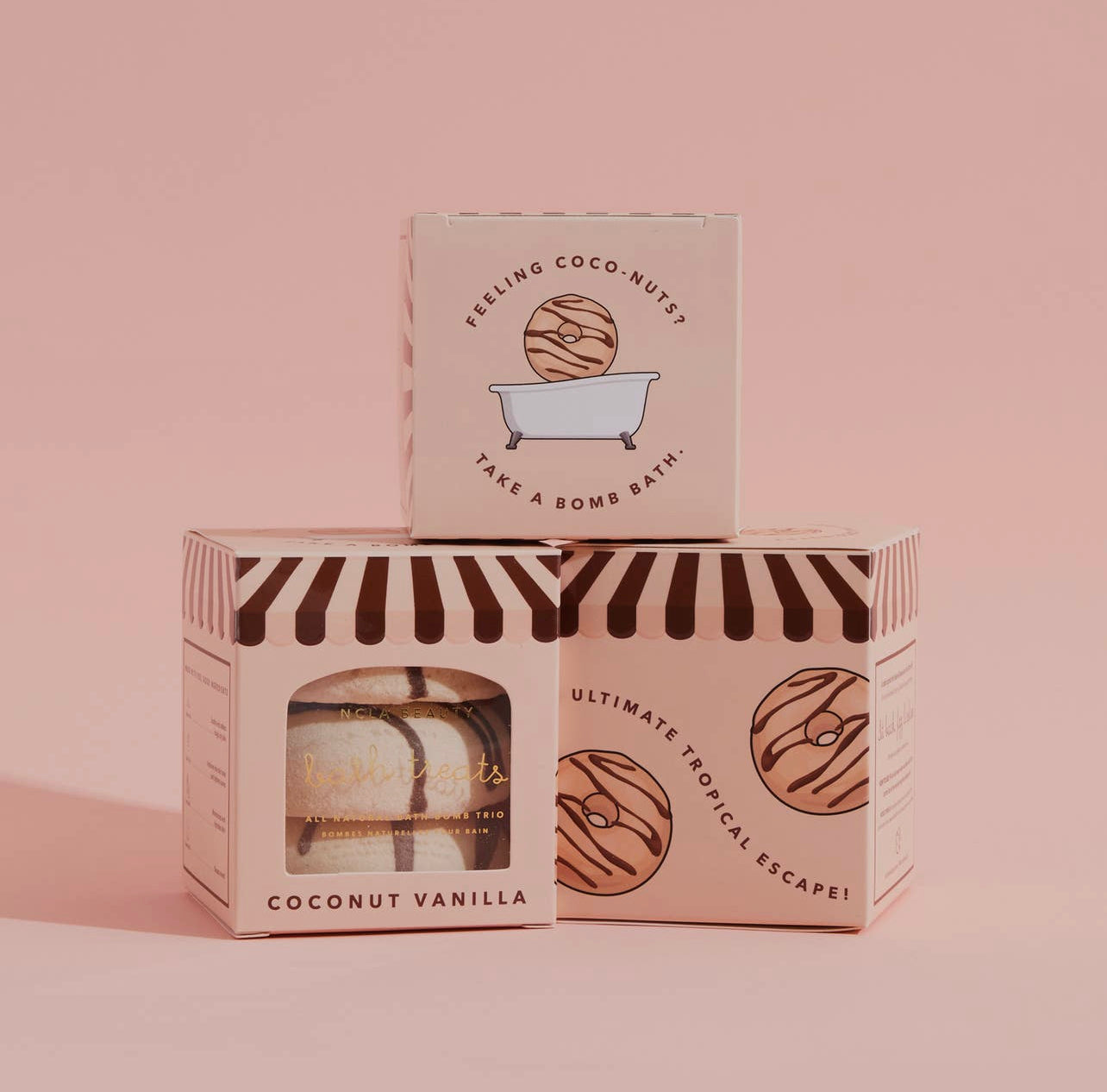 An ultra sweet trio of donut-shaped bath bombs in a delicious coconut vanilla scent. This hand made bath bomb trio will leave skin ultra soft and smelling delicious! Sit back, fizz, and relax! Each set comes with 3 donut shaped bath treats made with nourishing, skin-soothing, and hydrating ingredients like epsom salt, kaolin clay, and shea butter. It's also infused with an essential oil blend to bring an aromatherapeutic experience to your bath time.