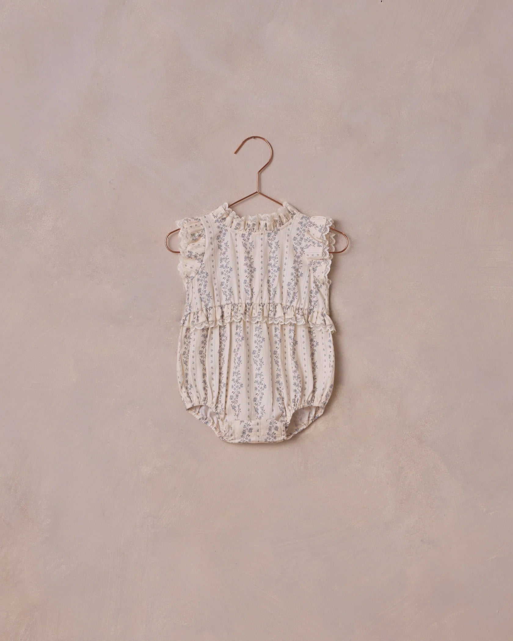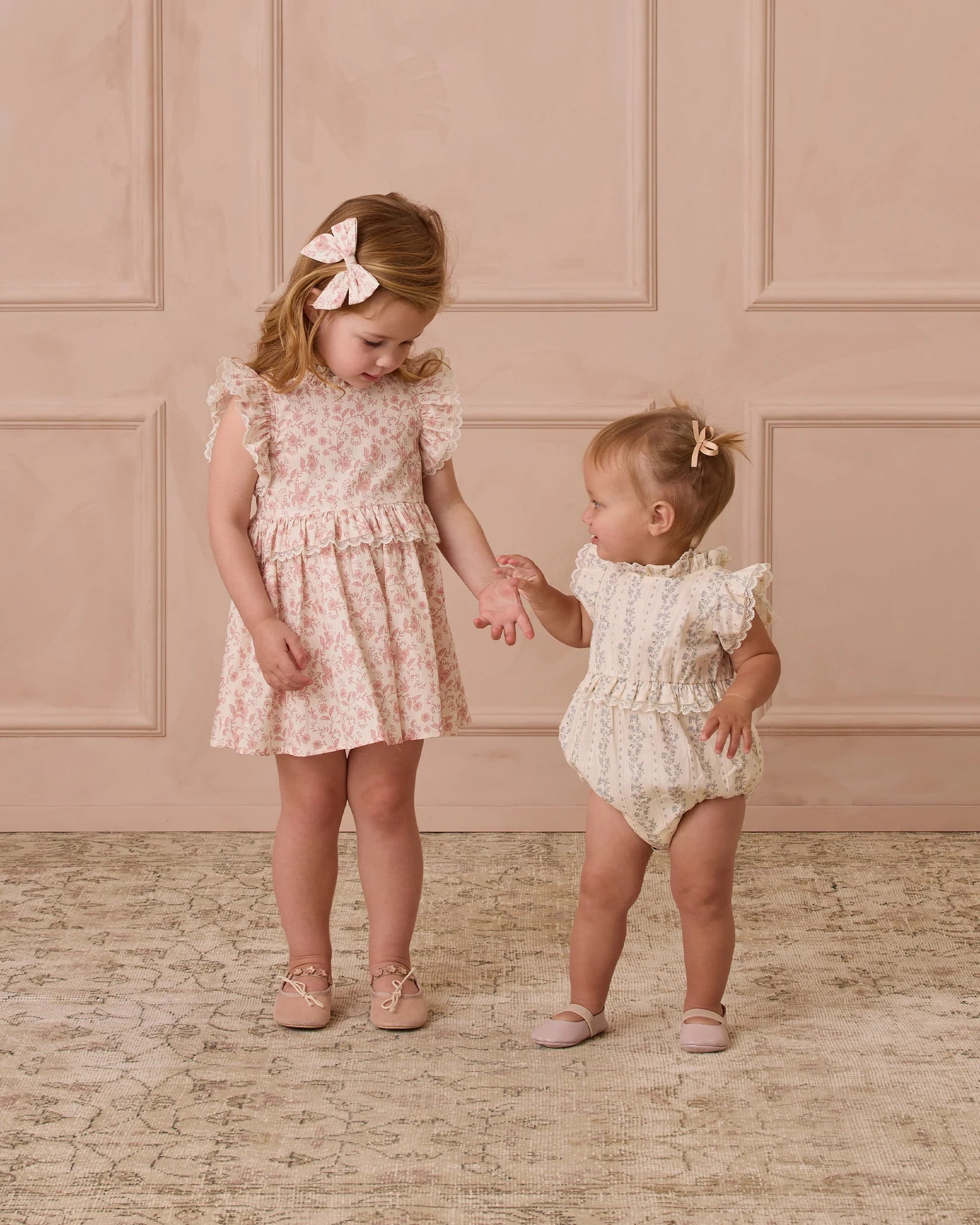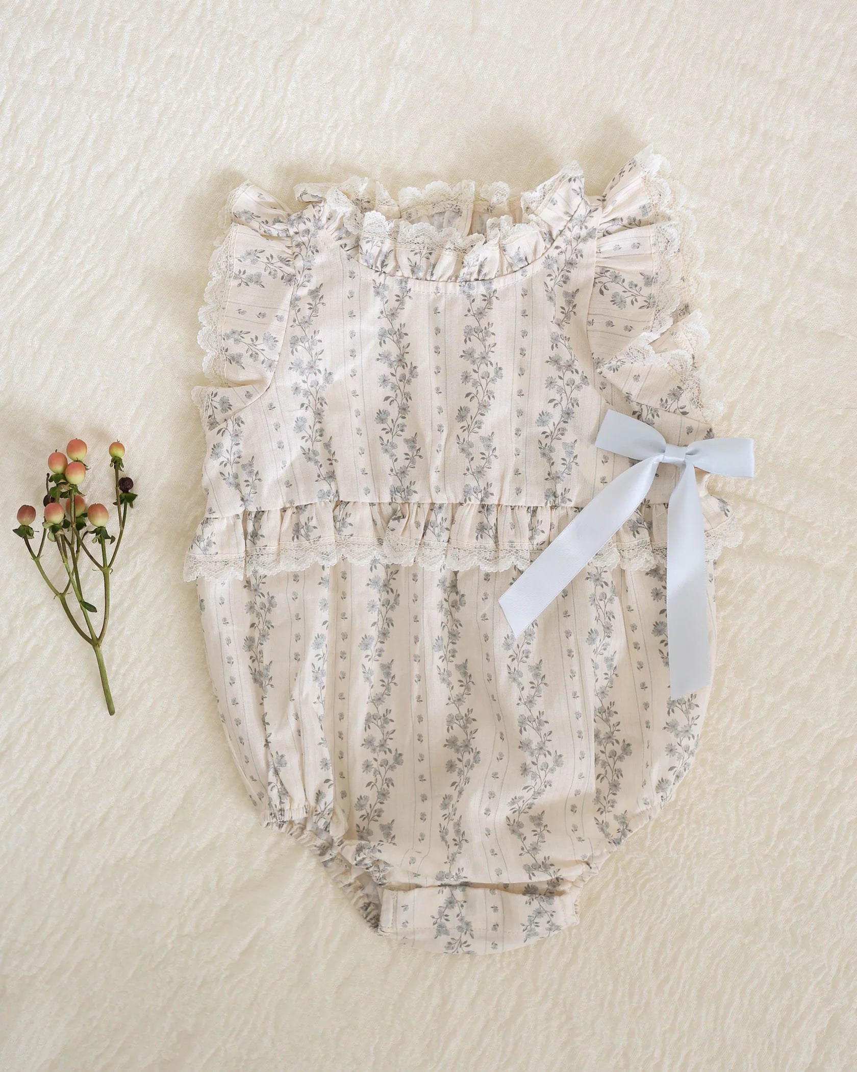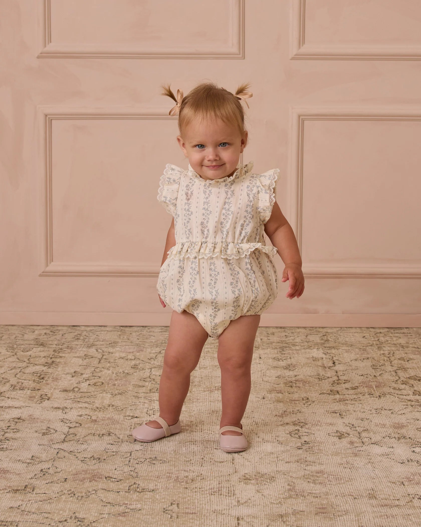 Delicate ruffle and lace trim come together in this sweet romper silhouette. Four button closure at the back, bottom snaps, and elasticized leg openings for easy dressing. Coordinates perfectly with our Alice Dress for a darling matching look.