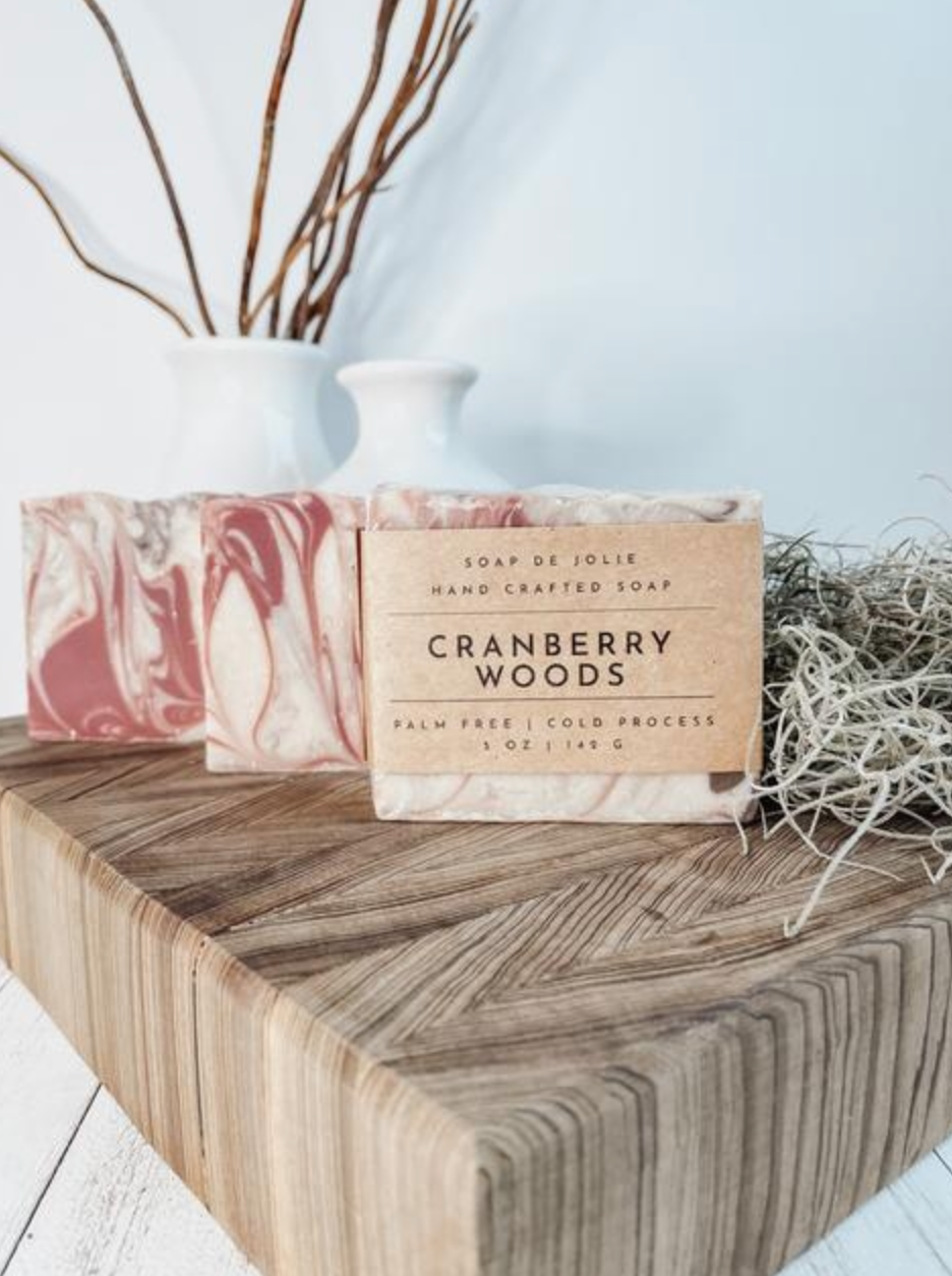 Our Cranberry Woods bar is woody and inviting. This scent combines rich wood tonalities with bursting tart cranberries. Undertones of cinnamon, orange, citrus, and apple.