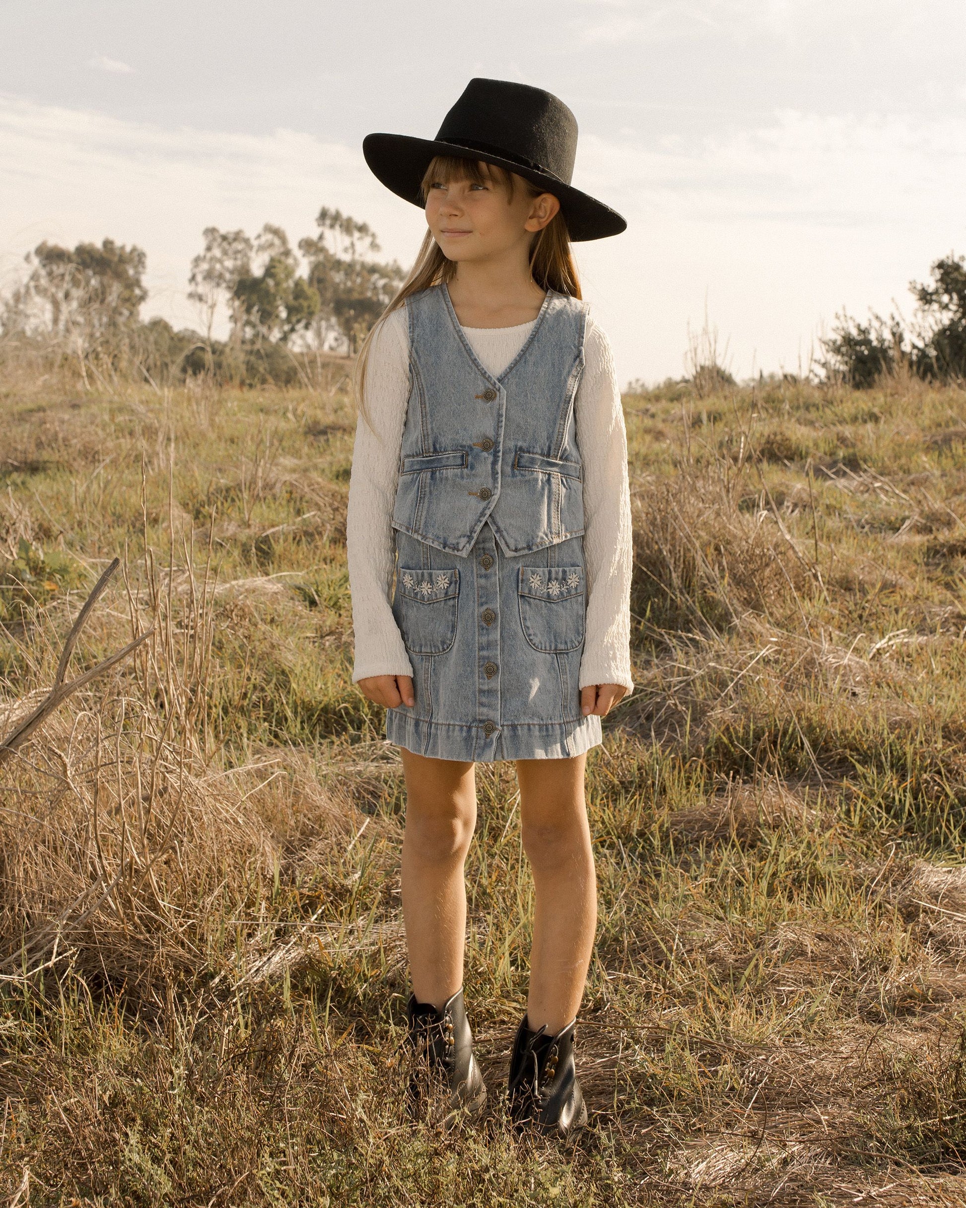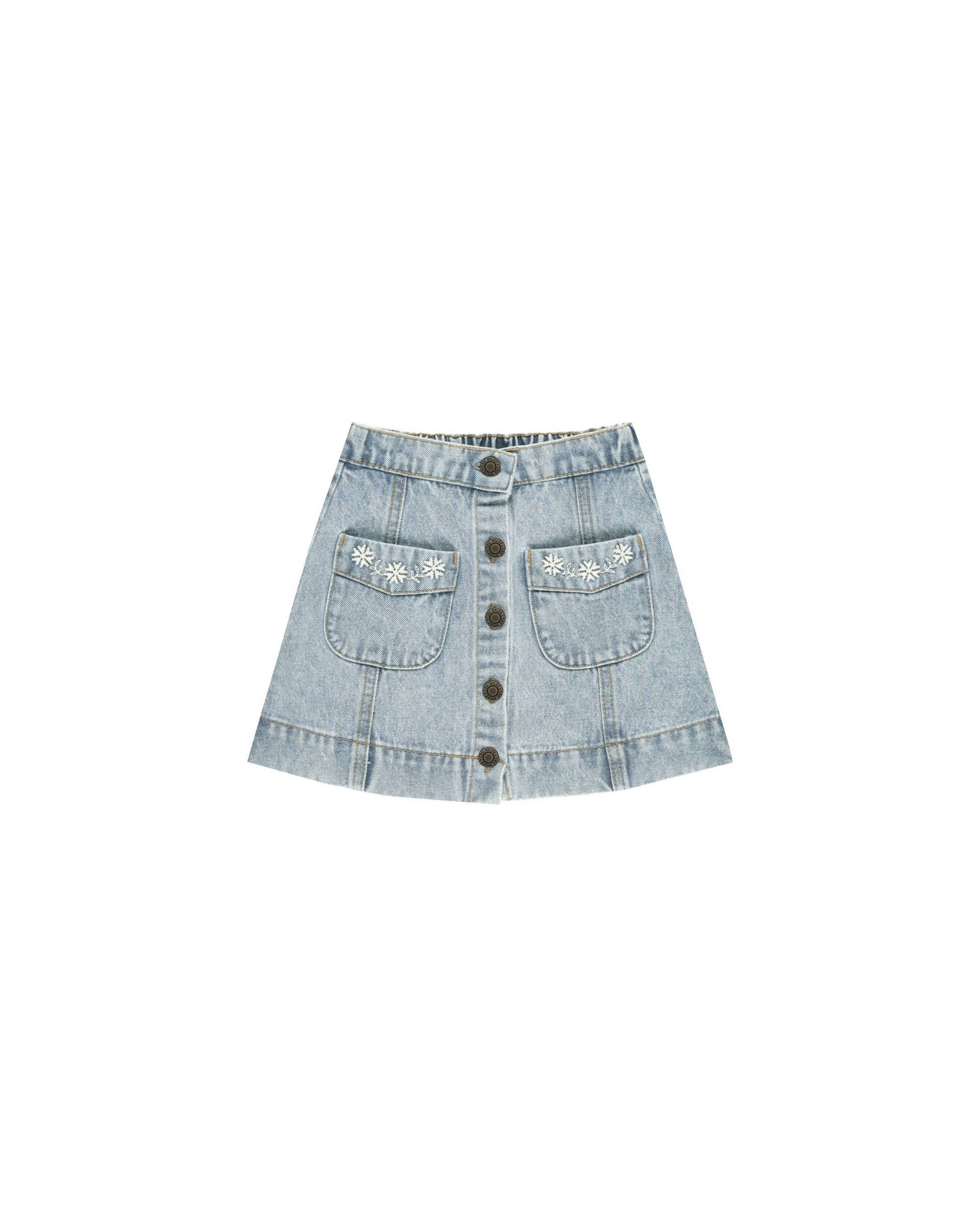 This versatile piece offers light washed denim for a cool look, accented with antique brass buttons and our floral embroidery on the front pockets.