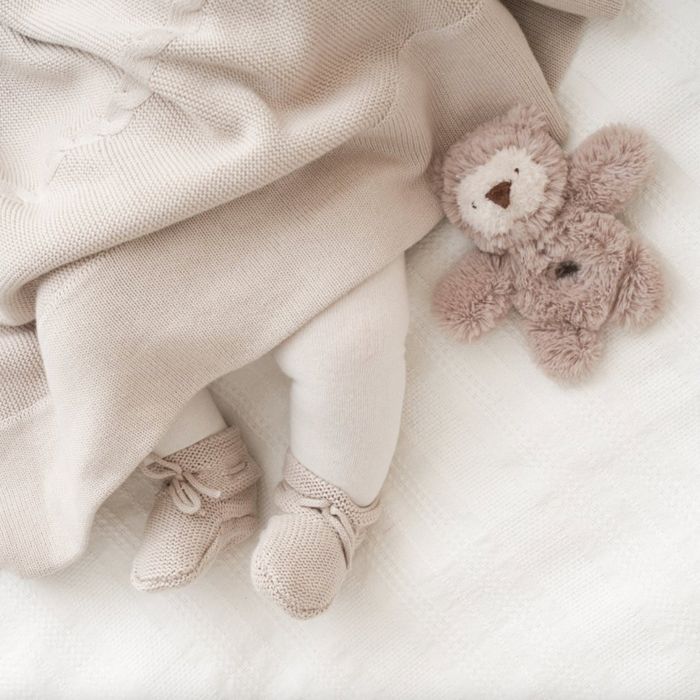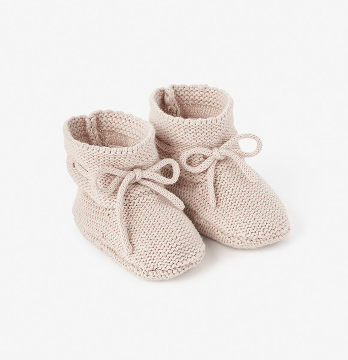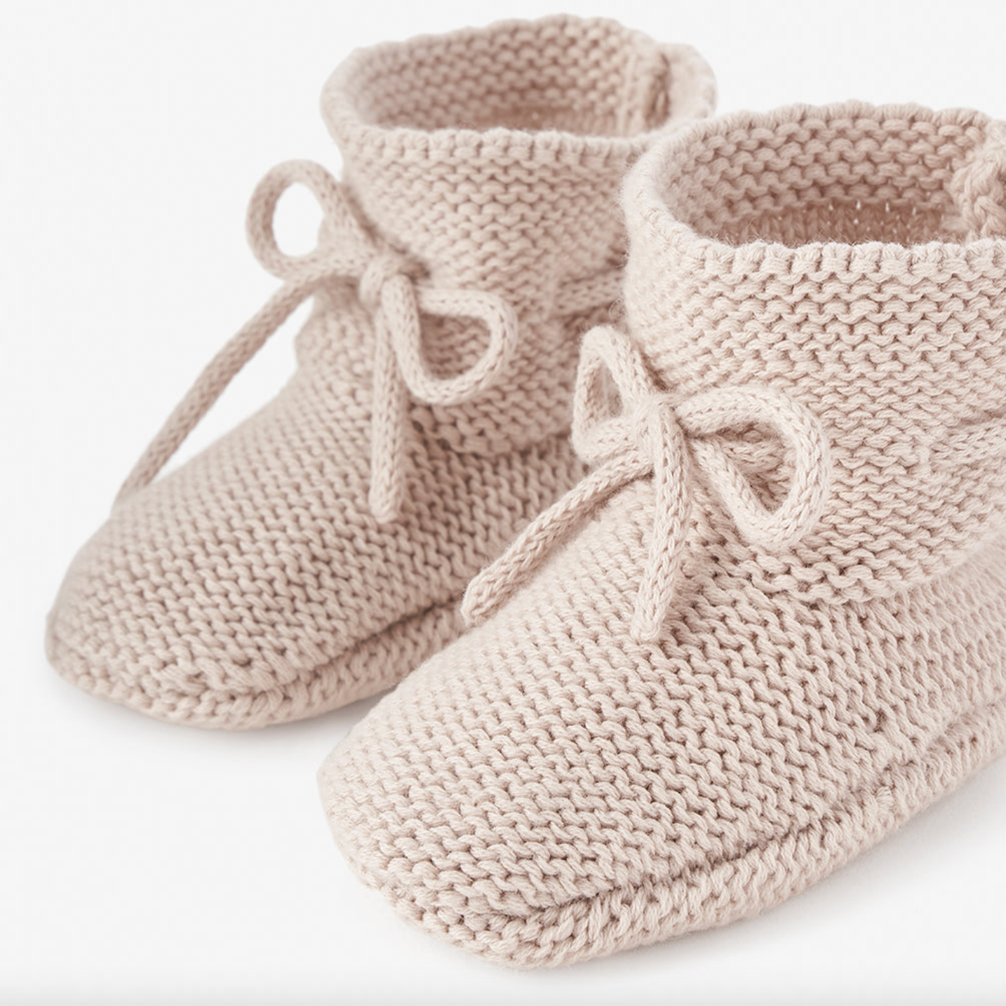 These comfortable hand-crocheted booties are the perfect, soft-sided shoe for every little one's tiny toes. The soft knitting feels dreamy on those sensitive baby feet. These adorable, cotton garter knit booties blend fashion and comfort for every little adventurer.