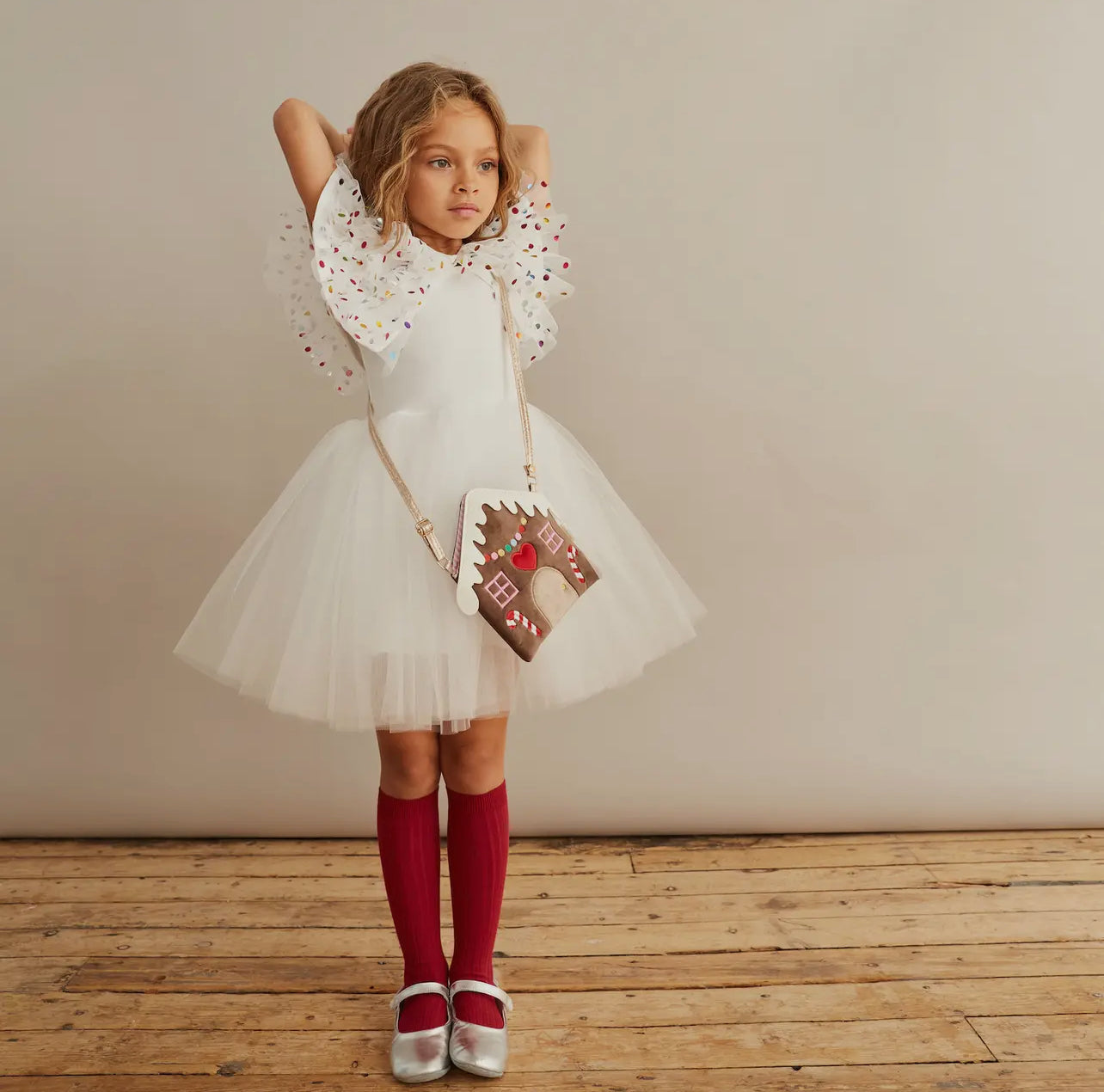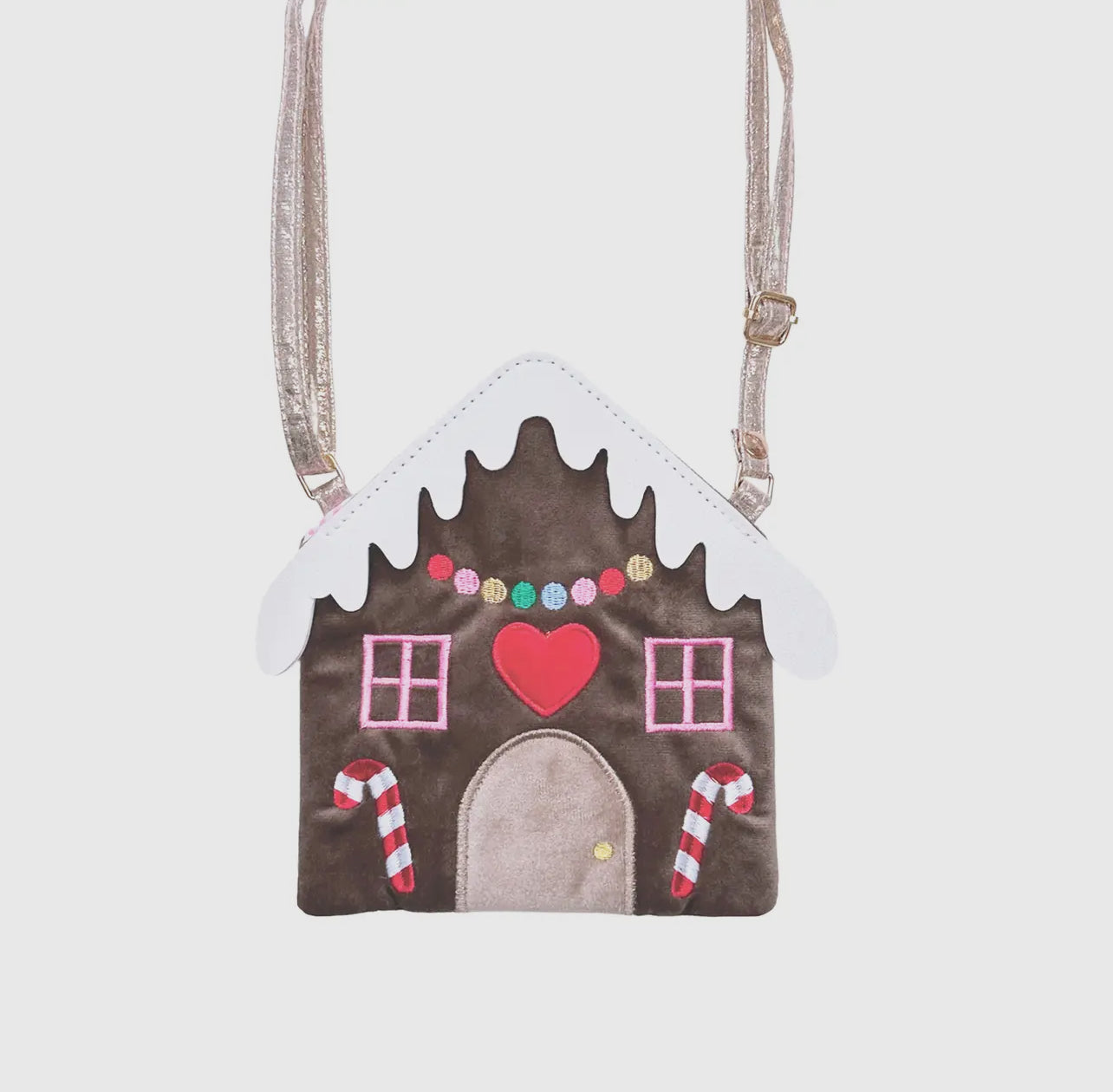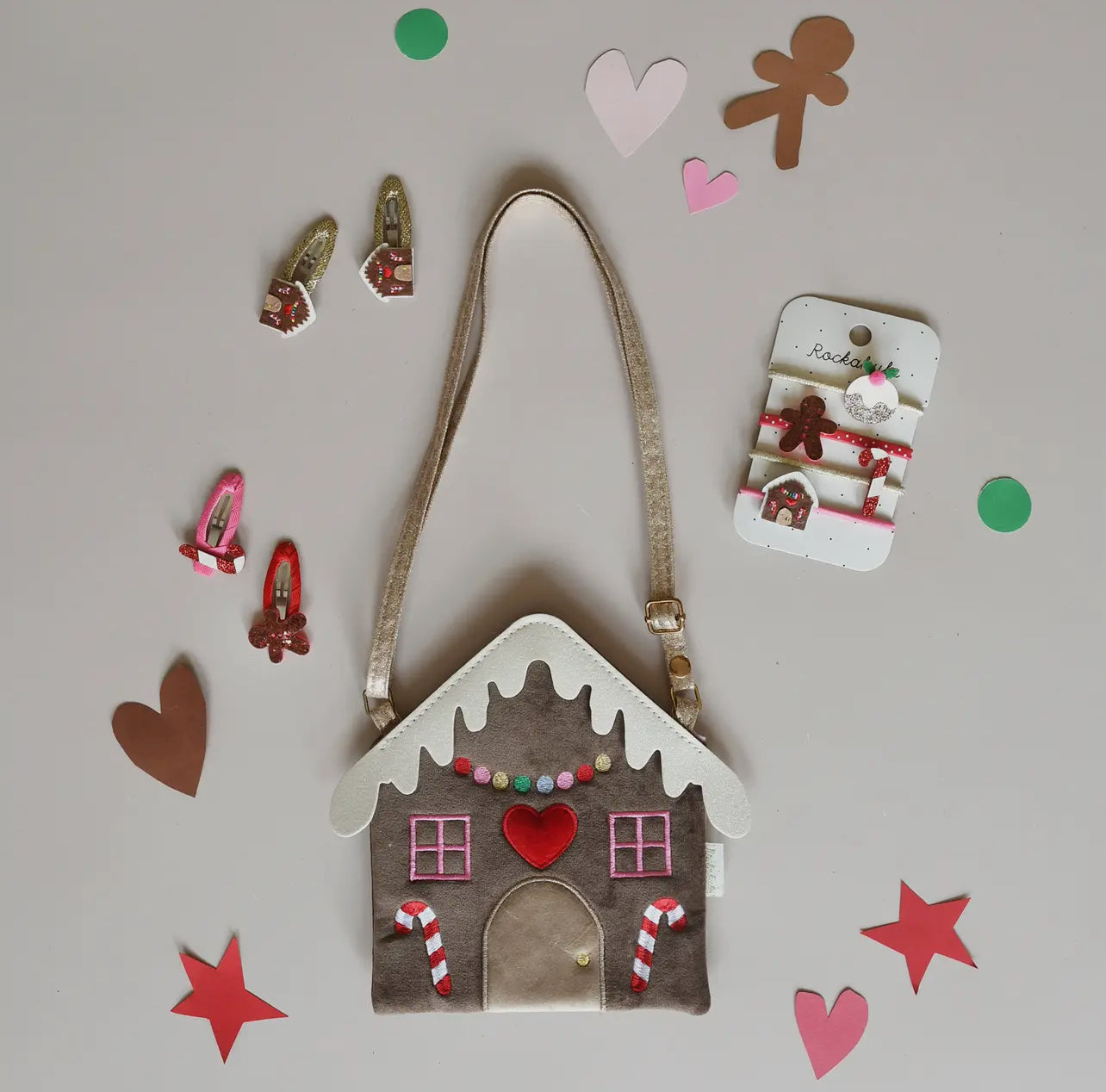 This cute cosy gingerbread house is perfect for stashing all manner of Christmas treats! Made from the softest brown velvet, with bright coloured embroidery details and a shimmering flock of snow. Fully lined in pink stripe fabric, this velvet bag features a magnetic dot closure and a gold strap with a break point for safety.