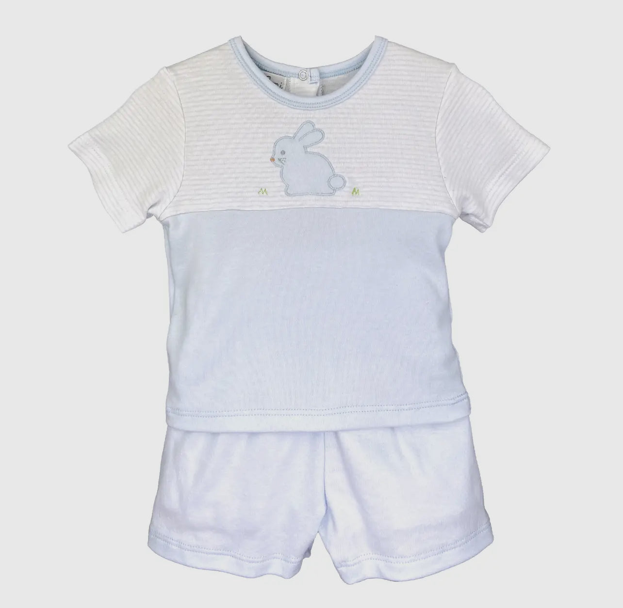 This short sleeve knit shirt features an Embroidered Easter bunny design on the front and matching light blue shorts.