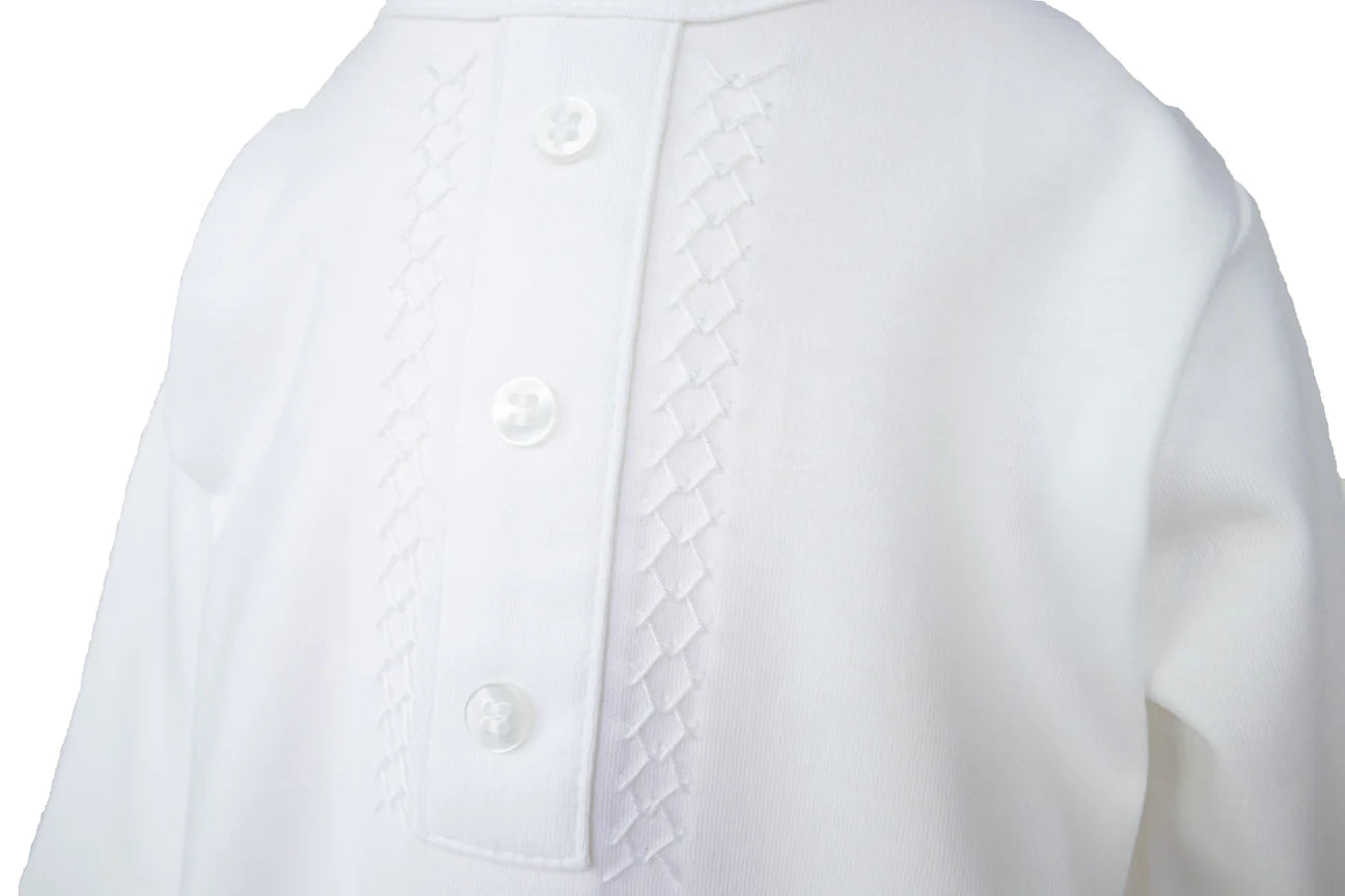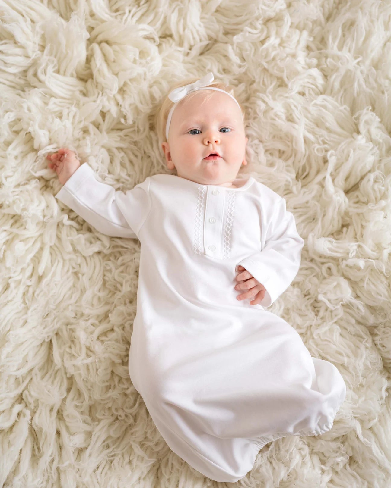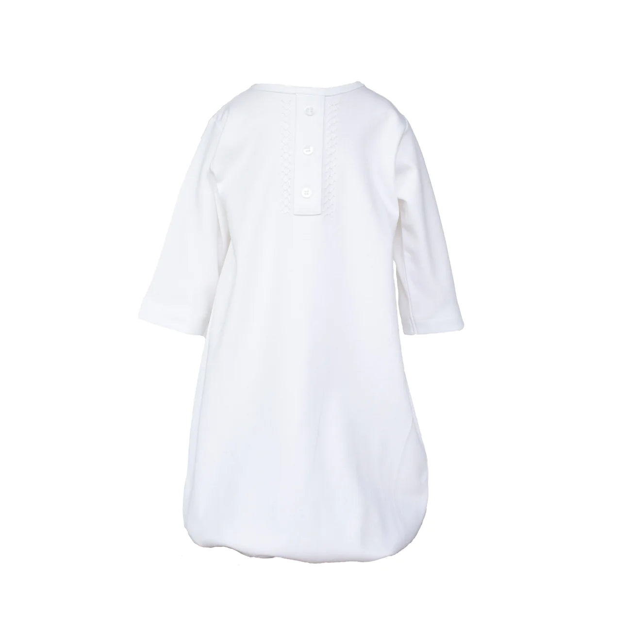Buttery soft long sleeve gown in white jersey fabric with an intricately hand embroidered design. The perfect gown for sensitive newborn skin