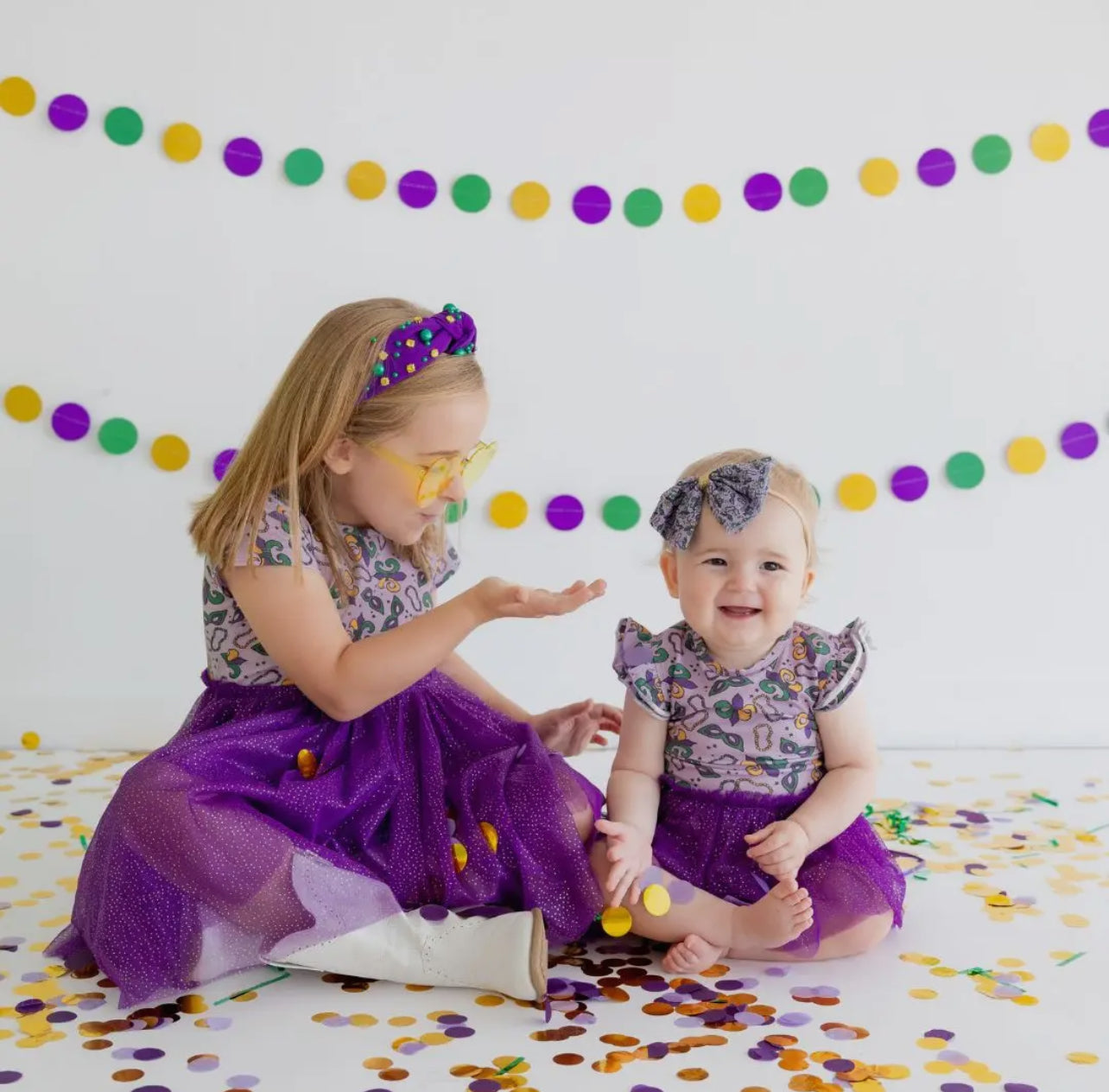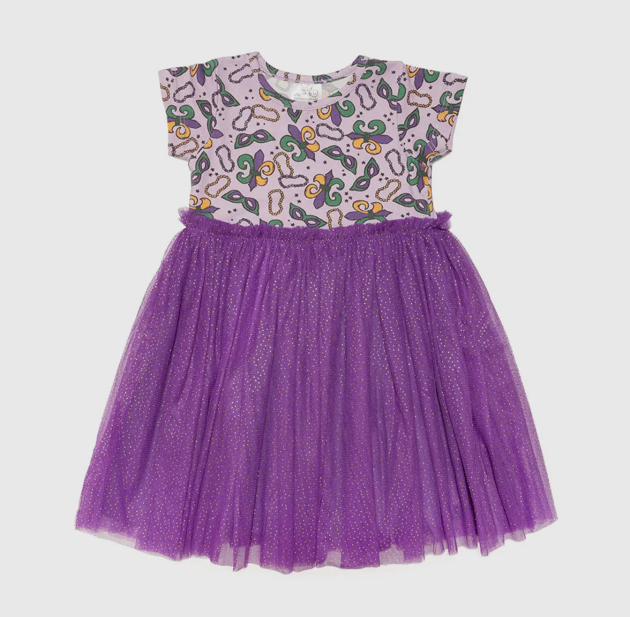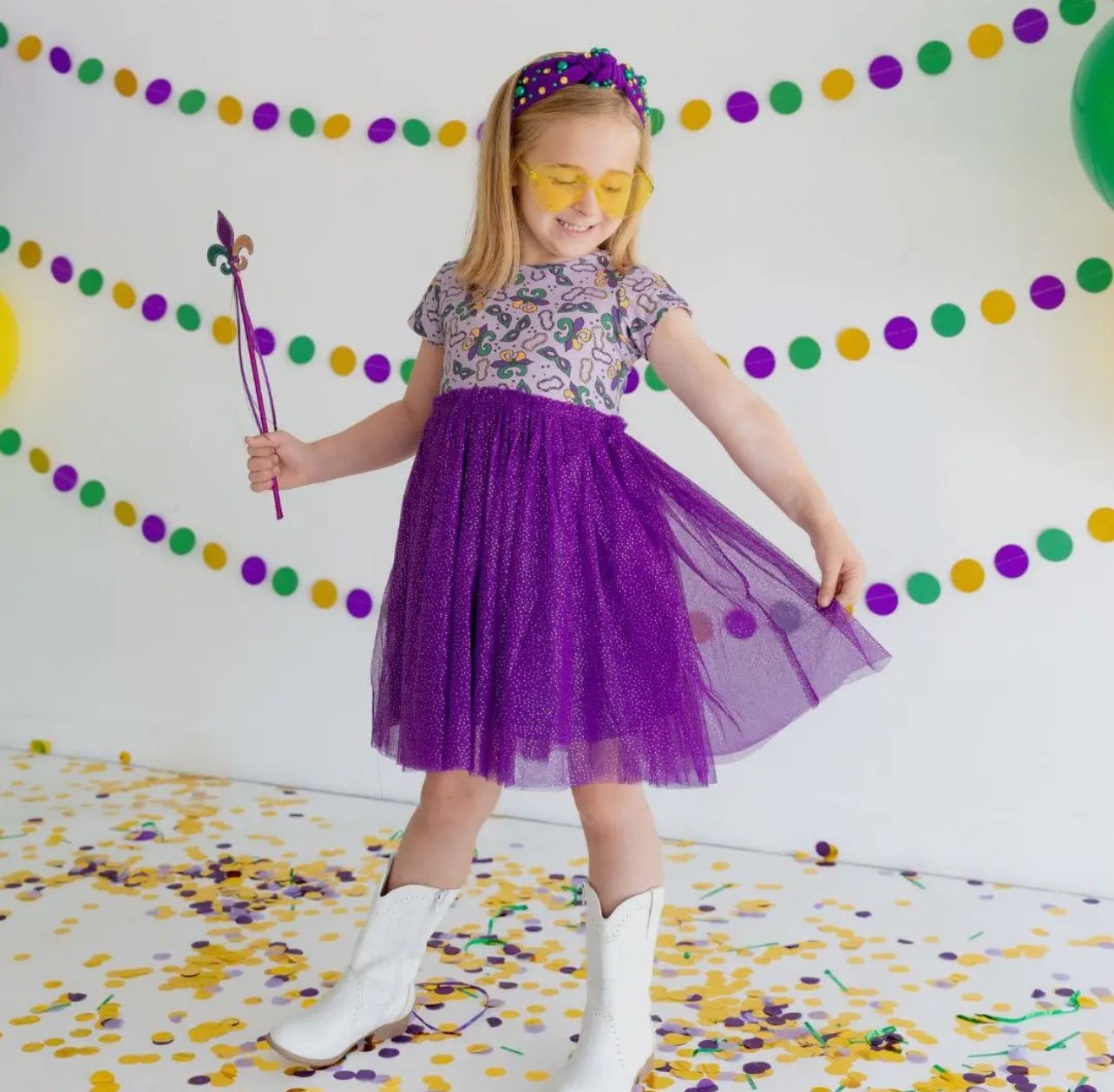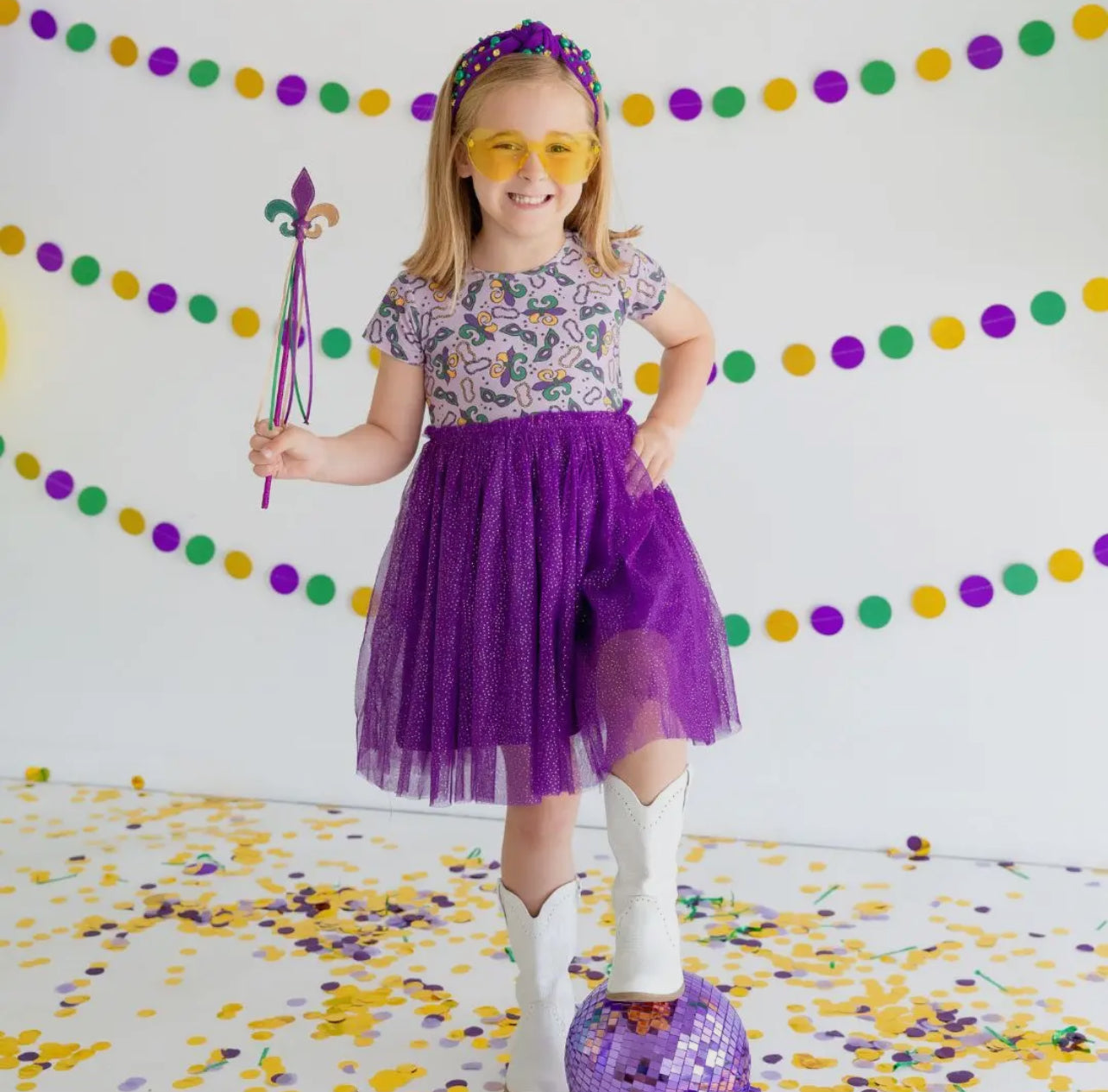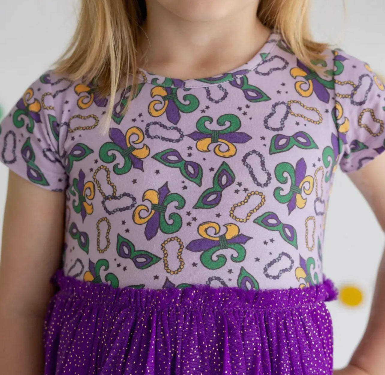 The Mardi Gras Short Sleeve Tutu Dress is the perfect twirl-worthy dress for any Mardi Gras celebration or everyday wear!