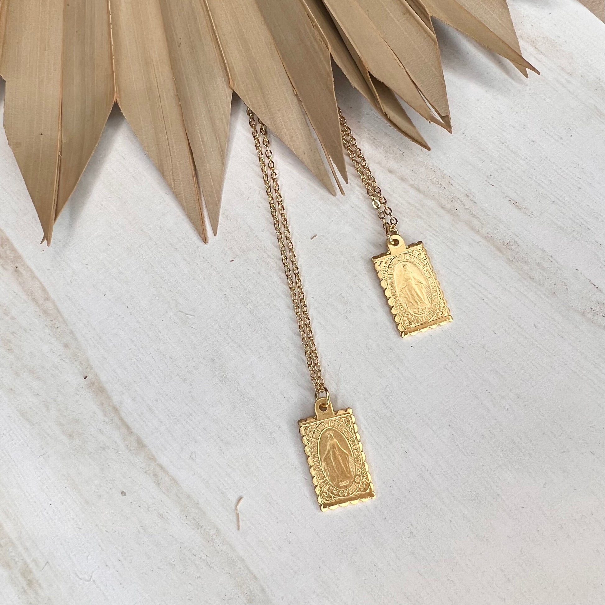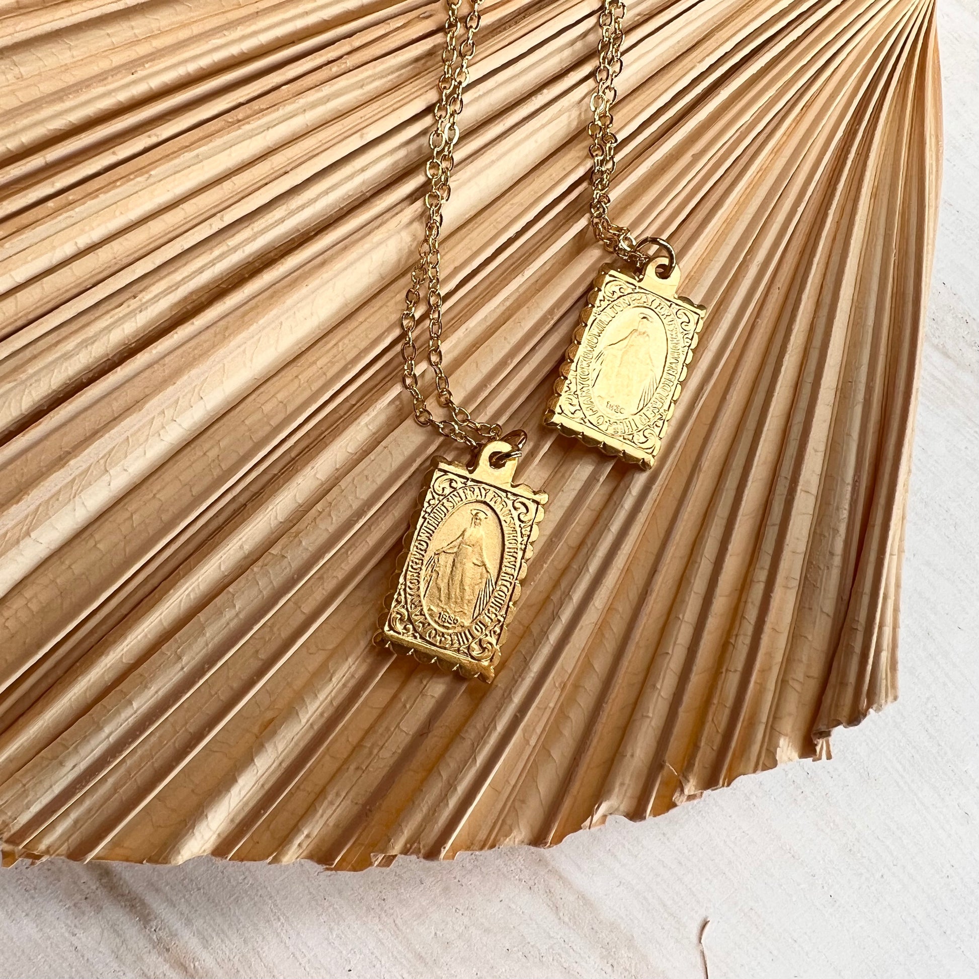 18K Gold Plated Bronze “O Mary Conceived w/o Sin Pray for us who have recourse to thee” small scalloped charm necklace