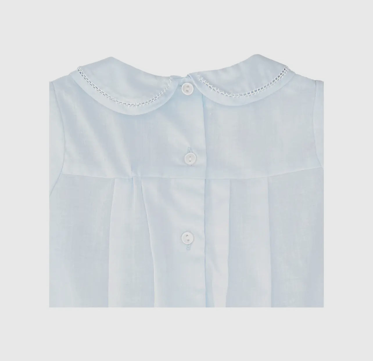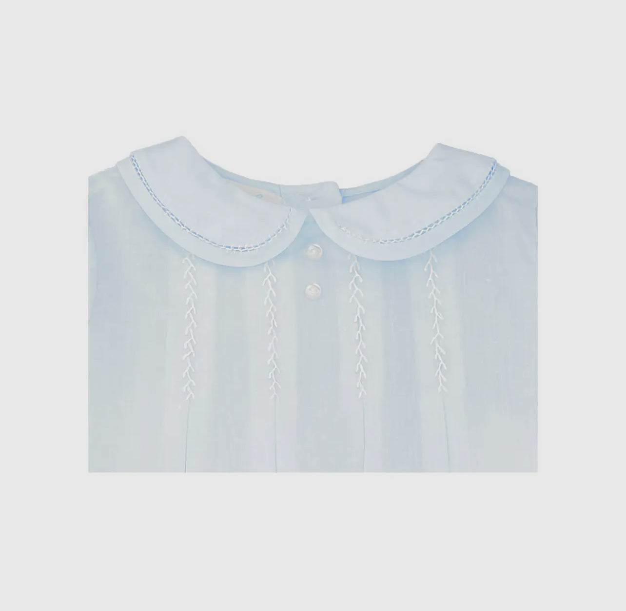 This piece is as sweet as if it were pulled out of your grandmother's cedar chest and is sure to become a treasured keepsake. Featuring heirloom-quality handcrafted details like inverted pleats and hand-embroidered feather stitches.