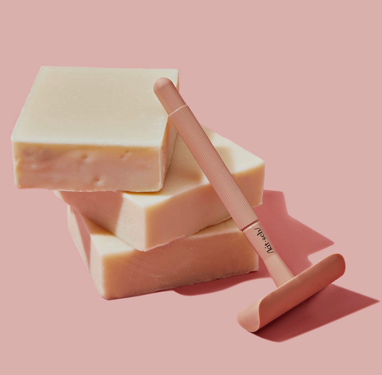 Glide Kitsch Shave Butter onto wet skin, applying generously to desired areas for a close, cushioned shave with the Kitsch Perfect Glide Safety Razor. It's a nourishing prep step for your plastic-free shaving experience!