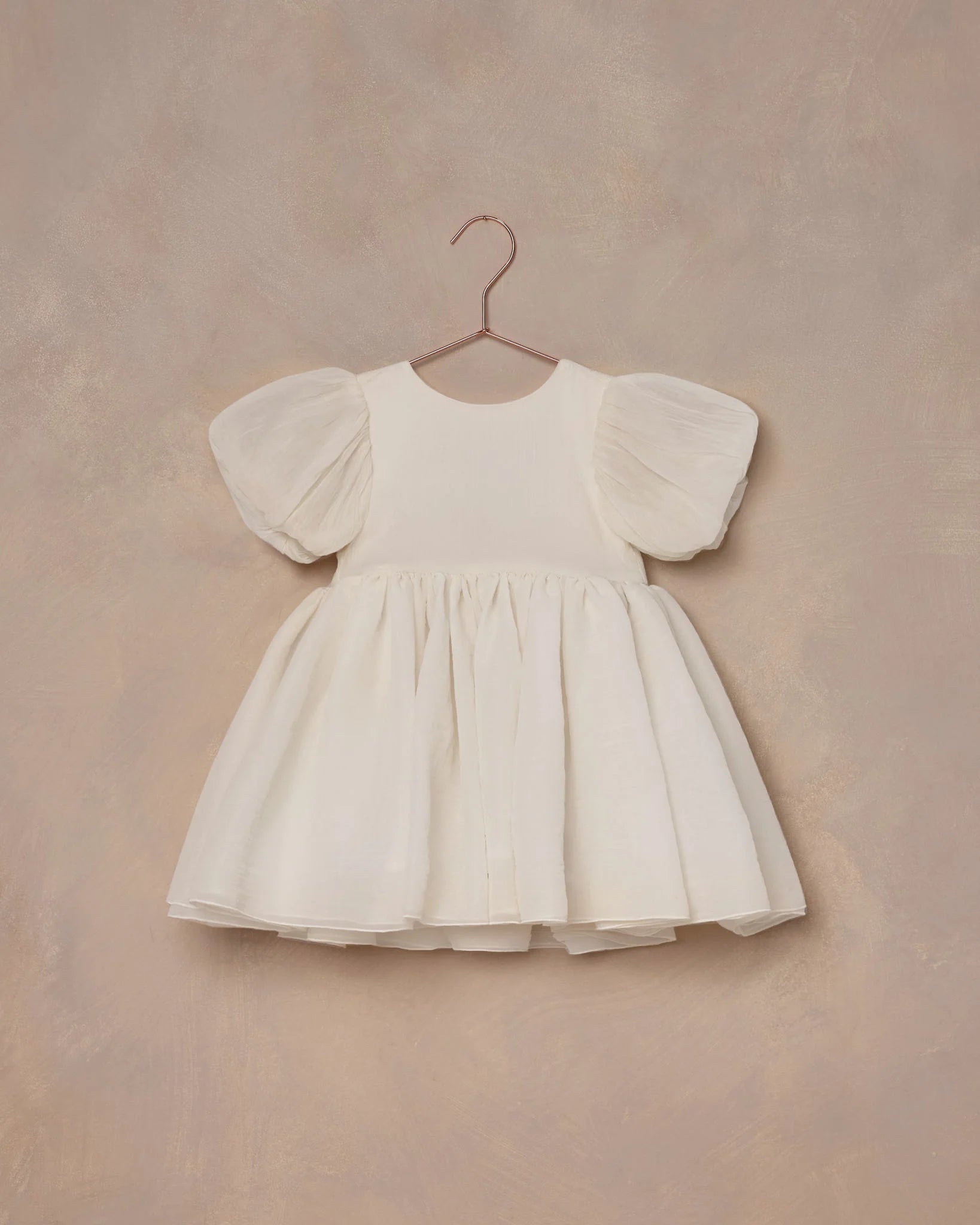 Sofia in ivory organza features a V back detail and zipper, oversized balloon puff sleeves, and a layered organza tulle skirt.