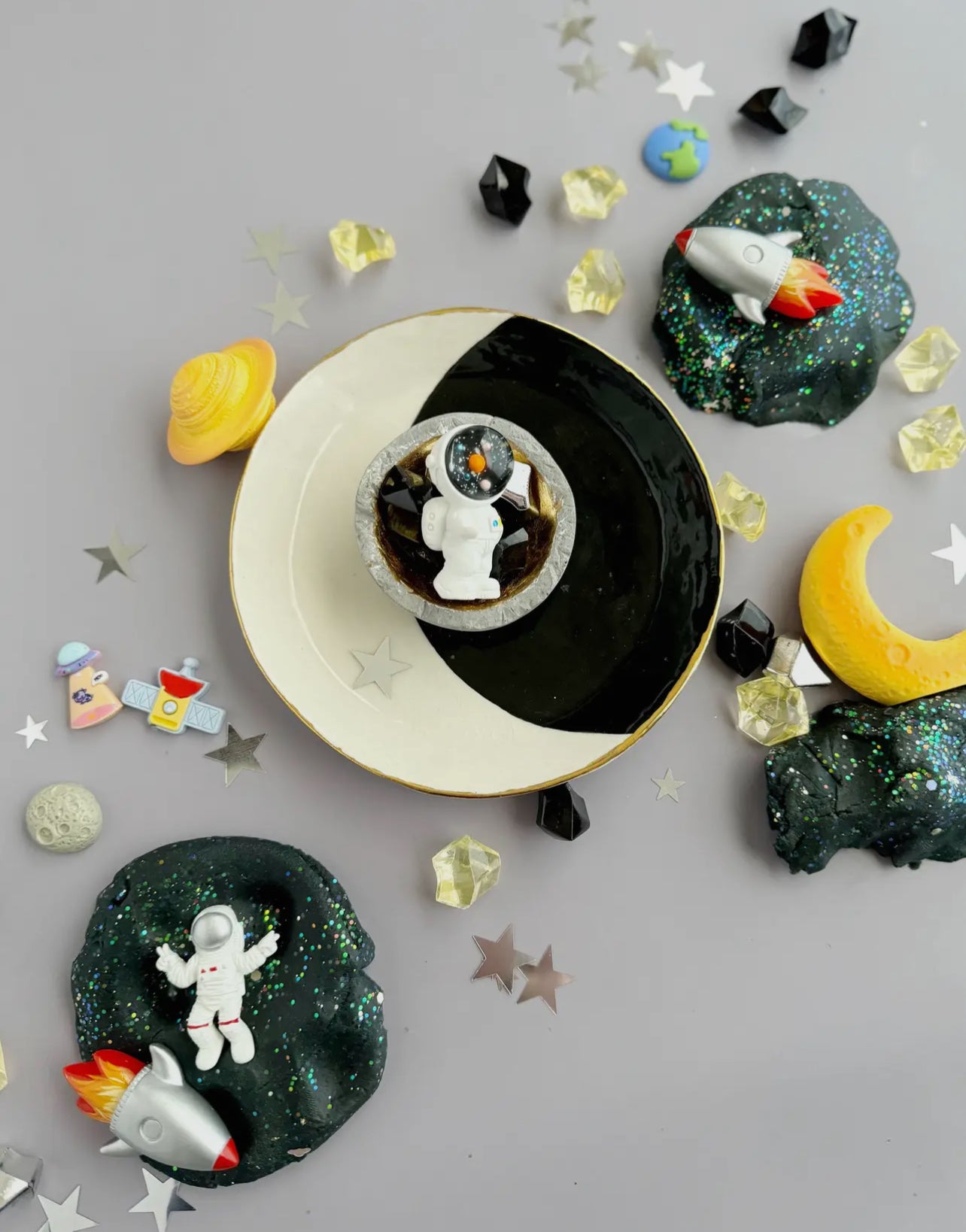 Includes: 8 oz Black (Black Cherry) KidDough with Space Glitter and Space Charms (Earth, Moon, Satellite, Astronaut, UFO), Astronaut Figurine, Planet Figurine, Crescent Moon Figurine, Rocket Figurine, Yellow, Silver and Black Acrylic Space Rocks