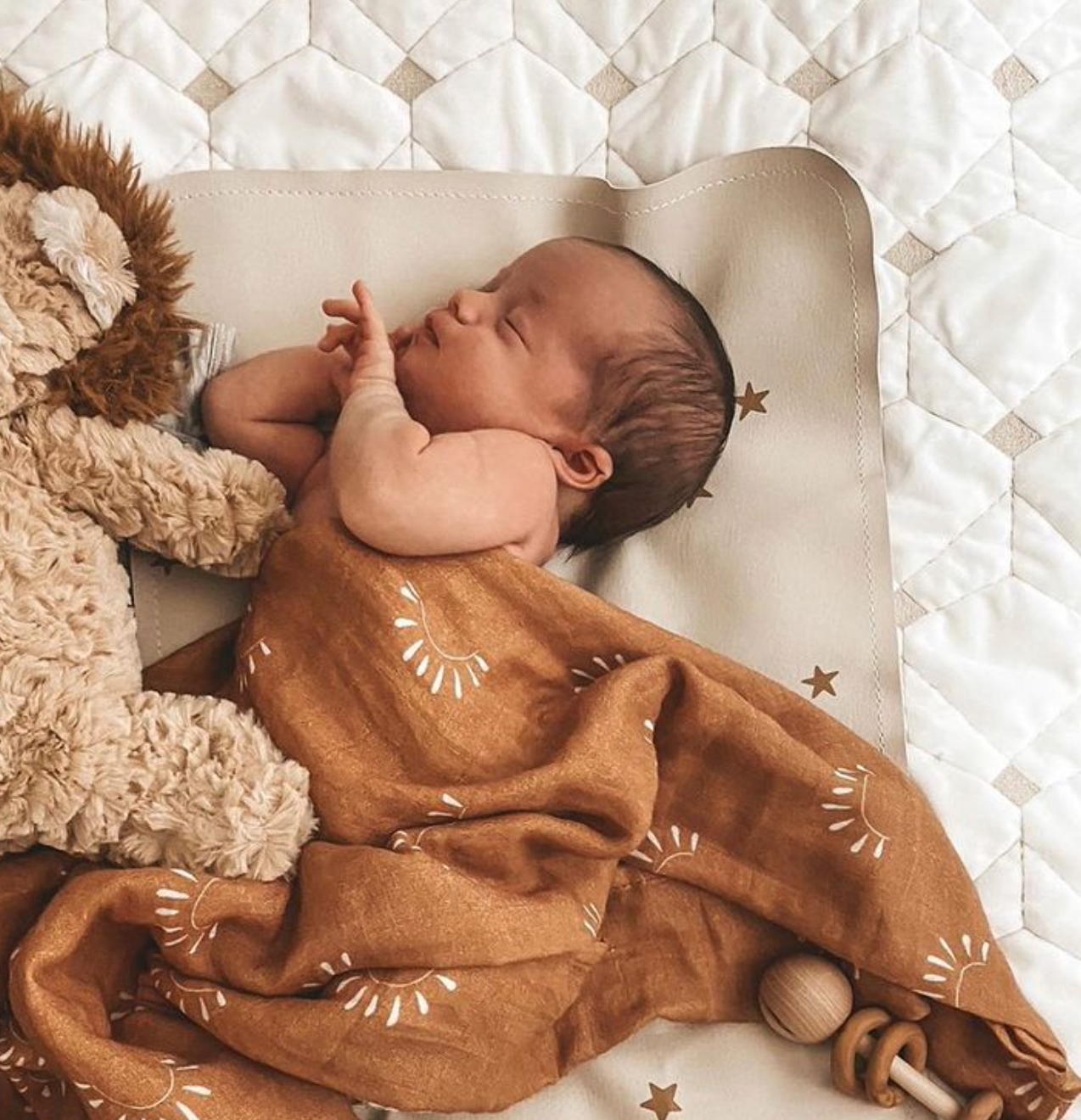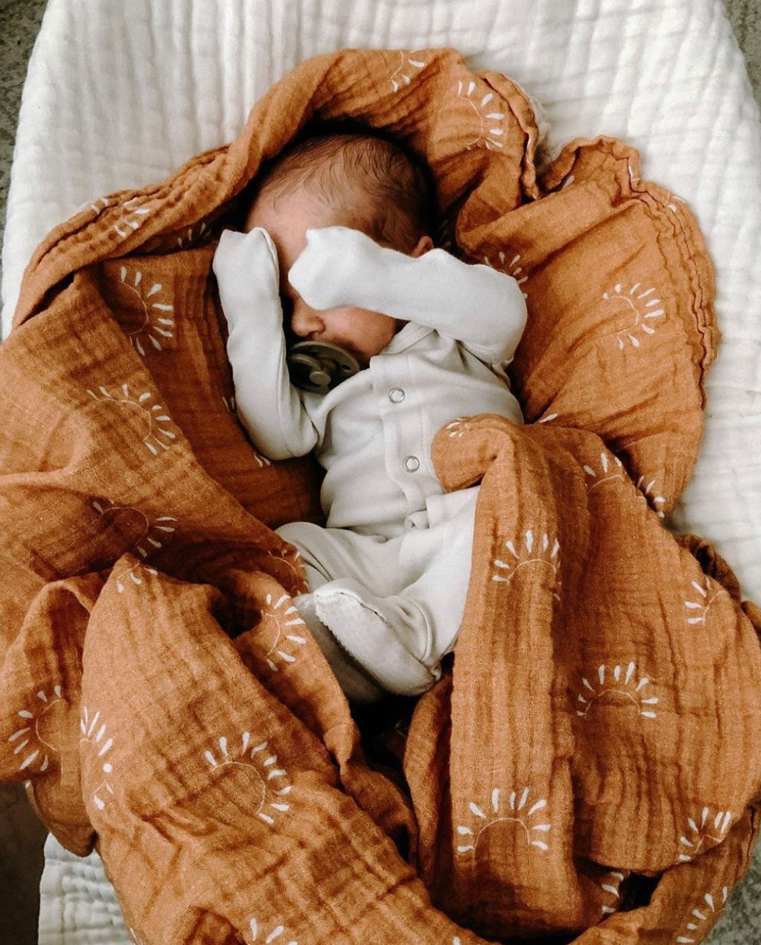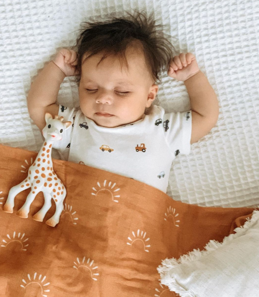 Our Sunrise Muslin Swaddle is 100% cotton and gets softer with every wash making it lightweight, breathable, and versatile. Can be used as a swaddle, nursing cover, stroller blanket, and so on.