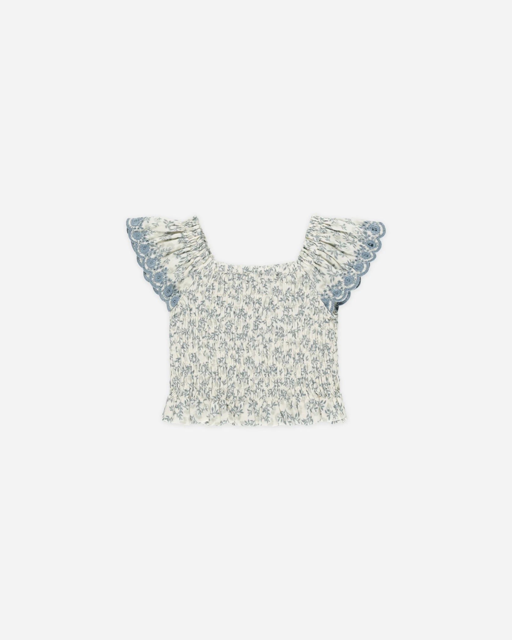 With ruffled sleeves and trim, a smocked bodice, beautiful eyelet detail, and all the style, Zayla is the blouse of the season.